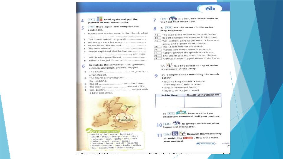 6b Robin Hood SB p.78 (93) Excel 5 module 6 ex3 Lord of t he Greenwood - YouTube 1.What do you know about R.Hood? 2.Where was he from? 3.Where did he live? 4.What did he do ? 5.What was he like? U S E : A.He was brave, honest, clever and loyal to the real king B.Hero of English legend C.England D.Cherwood forest E. He stole money from the rich and give it to the poor.