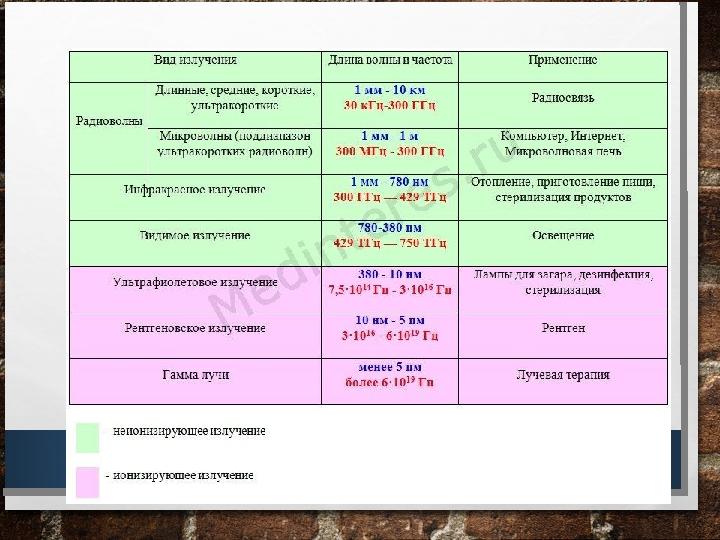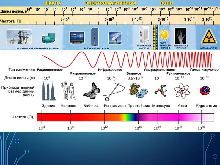 Электромагниттік толқындар шкаласы Төменгі жиілікті толқындар шығару радиотолқындар инфрақызыл сәулелер көрінетін жарық Жоғары жиілікті толқындар шығару ультракүлгін сәулелер рентгендік сәулелер γ-гамма шығару