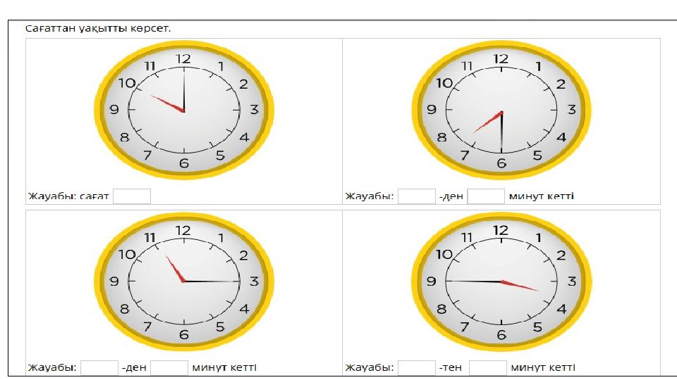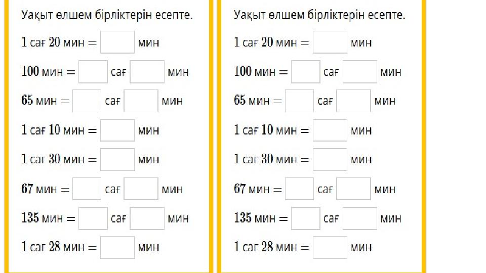 Уақыт және оның өлшем бірліктері 1 сағат = 60 минут 1 тәулік = 24 сағат 1 минут = 60 секунд 1 сағат = 3600 секунд 1 апта = 7 күн 1 ғасыр = 100 жыл 1 жыл = 12 ай = 365 (366) тәулік 1 ай = 30 немесе 31 тәулік(ақпанда 28 немесе 29 тәулік)