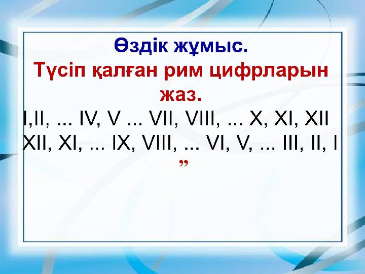 Тапсырма Берілген сандардың арасынан рим цифрларымен жазылған сандарды тауып, қоршап сызыңыз және оқыңыз. III4 20I 2 6 V 18 0 11X 3 9 12VI Берілген сандарды рим цифрларымен жазыңыз.
