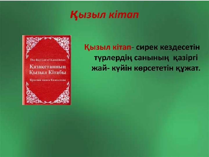 Қызыл кітап- табиғат қорғау одағының халықаралық дәрежедегі құжат. Қызыл кітапқа сирек кездесетін,жылдан жылға азайып,баа жатқан жануарлар мен өсімдіктердің түрлері тіркеледі.Ең алғаш қызыл кітап 1966жж тұңғыш рет 2 том болып жарық көрді.Оның қызыл және сары парақшалары бар. Қызыл бетінде құрып бара жатқан, сары бетке саны аз аң – құстар,жазылған