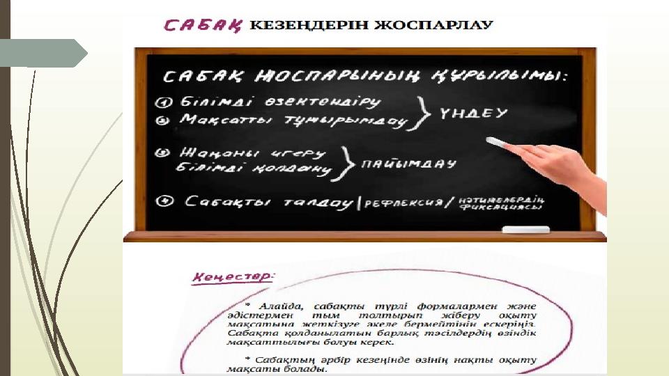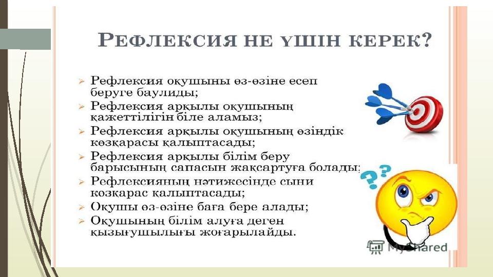 ОЙЛАУШЫ МҰҒАЛІМ Сізге пайымдауға көмектесетін және сіздің әрекетіңізді түсінетін сұрақтарға жауап беріңіз: Менің сабағымның стратегиясы сәтті болды ма? Сабақты басқаша тиімді етіп жасау үшін қалай құру керек? • Менің оқушыларым сабақта бірдеңе үйрене алды ма? Егер үйрене алса, онда ол ненің арқасы? Егер жоқ болса, онда себебі не? • Сабақта алдымен маған қиын болғаны қайсысы? Келесі жолы мұндай жағдайда нені қолдану керек? • Тиімді оқытудың мысалдары болды ма? • Сабақты басқаша жүргізуге болушы ма еді? Егер болса, онда қалайша? • Оқушының жұмысы қаншалықты объективті бағаланды ма? • Оқушыларға оқу жұмысында өздеріне басқару мүмкіндігі берілді ме? • Сабаққа қандай тәжірибе енгізілді? Табысты болу үшін тағы да озық не істеу керек?