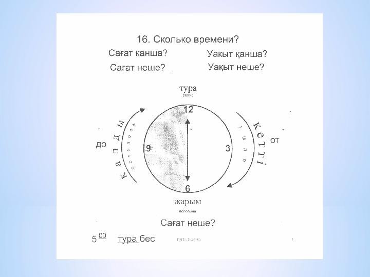 Сабақтың тақырыбы: Сағат он екі болды Сағат неше болды ? – Который час? тура- ровно қалды -осталось кетті- ушло жарты - половина