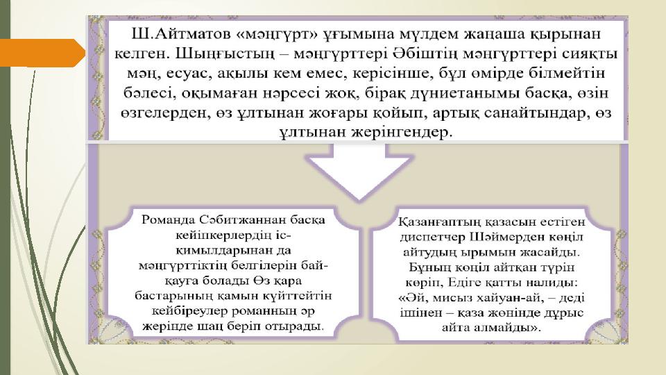 1- мәтін Тарихи тегін, ата-бабасын біле тұра, білгісі келмейтін, кешегісі мен бүгінгісі, болашағы туралы ойланбайтын рухани мәңгүрттік қолдан жасалған мәңгүрттіктің жанында барлығы жолға қалады. Қырғыз жазушысы қаламынан туған мәңгүрт тарихтан тыс қалған рухани мәңгүрт. Романда мәңгүрт обрызының Сәбитжаннан басқа кейіпкерлермен тікелей байланысы болмағанымен, олардың іс-қимылдары арқылы да мәңгүрттіктің элементтерін байқауға болады. Өз қара бастарының қамын күйттейтін осы бір образдар романның кейбір тұстарында байқалады.Қазанғаптың қазасын естіген диспечер Шаймерден көңіл айтудың ырымын жасайды. Бұның көңіл айтқан түрін көріп Боранды Едіге қатты налиды: «Әй, мисыз хайуан- ай,-деді ішінен, -қазанын жөнінде дұрыс айта алмайды» Шаймерден өлікті сыйлаудың неекенін білмейтін мәңгүрт. Жұмысын ауыстыруды сұраған Едігеге: