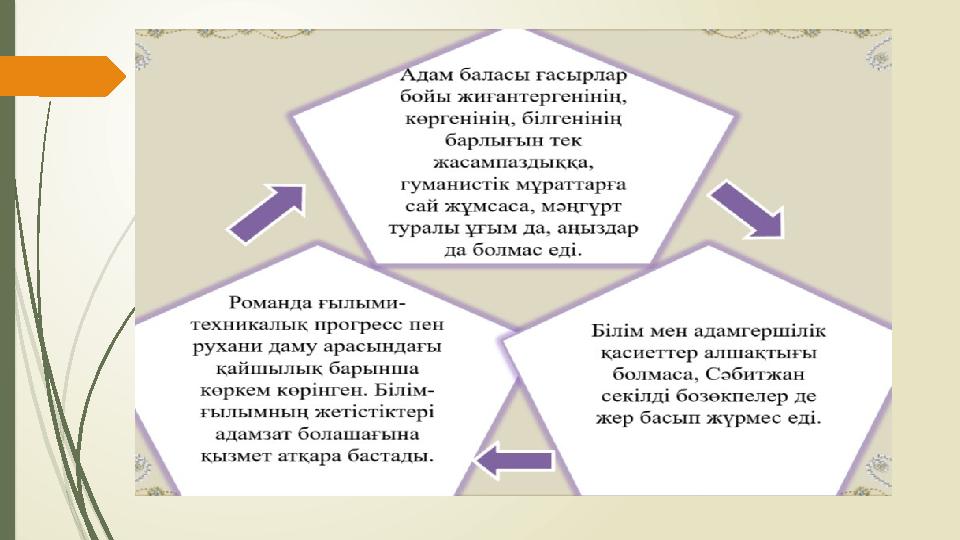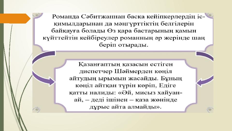 3- мәтін Үш кеңістікте (мифологиялық, әдеби-реалды, ғылыми-фантастикалық) өтіп жатқан уақиғалардың кісілік байламы Едіге санасында белес алып жатқан секілді, мәңгүрттік белгілердің баршасы Қазанғаптың жалғыз ұлы Сәбитжанның мінез-құлқы, ой өрісі мен жүріс-тұрысынан тұрақты белгі беріп отырады. «...аз ауылдың әйелдері сыпсыңдап, бұрқылдап жүр: әкесің жерлеуге емес, мейман боп келгендей ғой мынау өзі.Әлгі қаладағы сұрқия әйелін айтсайшы. Туған атасы өліп жатқанда, аруағын сыйлап, ататайлап келіп, жылап-сықтап жоқтаса қайтеді» -деп өзі сынды рухани кем әйелінің обрызын жазушы көрсете кетеді. Едіге мен Сәбитжанның түсінігі, рухани байлығы екі басқа. Едіге- ойшыл, сыршыл, көпшіл, ерен ер. Ал Сәбитжан болса, дүние қызығын ақшадан, «қызыл дүниеден» іздейтін, рухани жетім тұлға. Оның Едігеден айырмашылығы-оқыған, жоғарғы білімді маман. Алайда, білім ордасынан ол арамдық жолдарын ғана игерген. Диплом қалтада, сондықтан оның «білмейтіні жоқ, универсал». «Сәбитжан секілді «жаңа» мәңгүрттер оқу, ағарту ісін рухани еркіндік әперетін игілік емес, өмірге қажетті мүлік пен жиһазға кенелетін құрал ретінде таниды