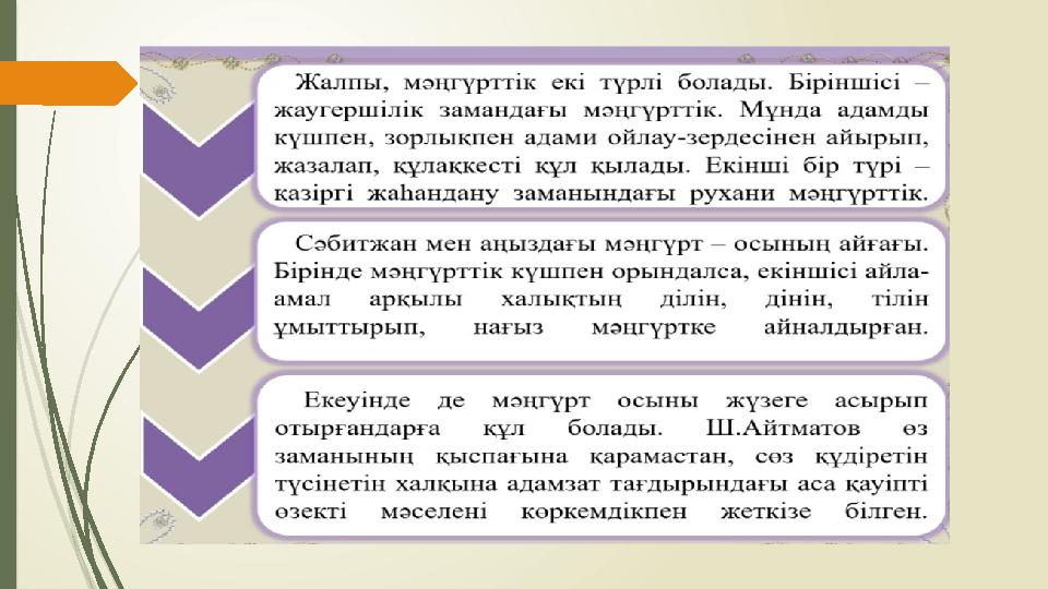 Бекіту. «Сұрақтарға жауап бер» әдісі 1.Шығарманың кейіпкерлері кімдер? 2. Мәңгүрттік мәселесі қазіргі қазақ халқы үшін өзекті ме? Үйге тапсырма: Ш. Айтматов «Ал ғашқы ұстаз » оқу,талдау өзіндік жұмыс .