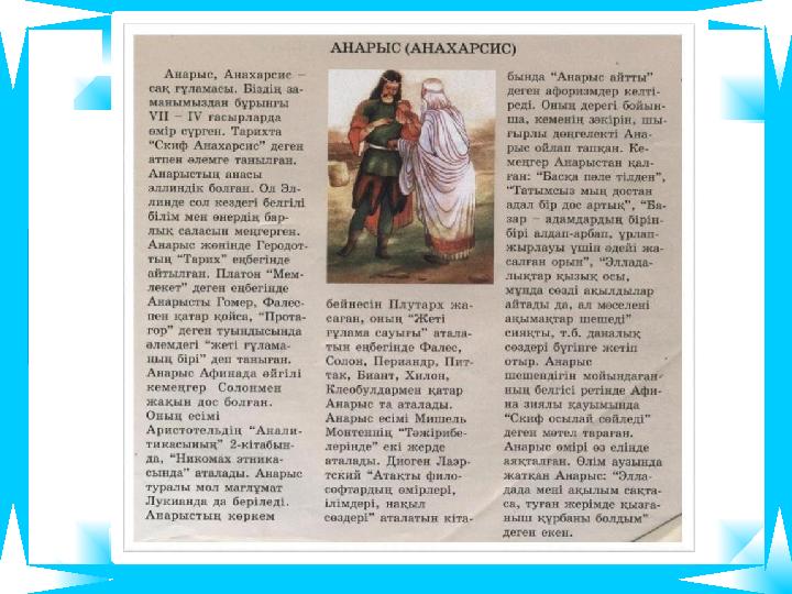 «Жалғасын тап» Анахарсис б.з.д. V ІІ- V І ғ.ғ. Шамасында өмір сүрген, тарихта скиф Анахарсис деген атпен әлемге танылған ..............