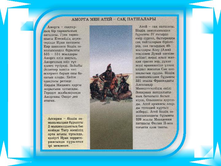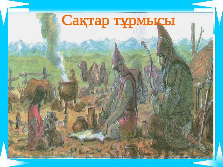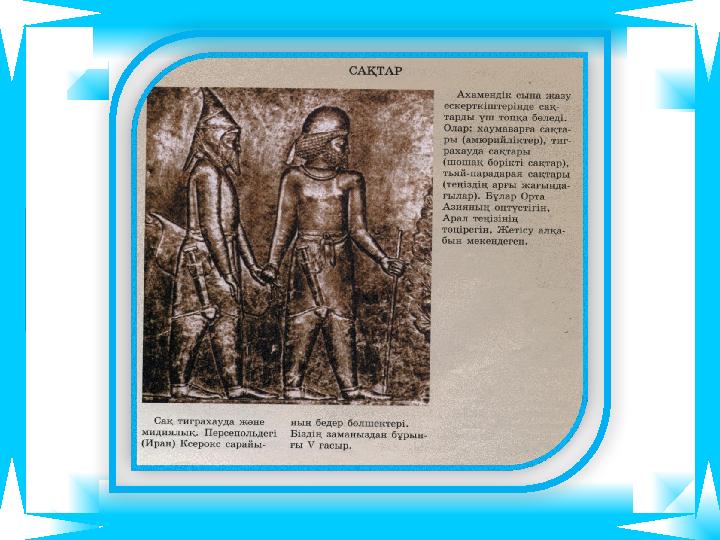 Авторлар Деректер көзі “ Сақтар әлемдегі ең шыншыл, ең әділ халық” “ Сақ әйелдері ержүрек келеді, соғыс қаупі төнгенде ерлеріне көмек көрсетіп, ұрысқа араласады.” “ Сақтар - жақсы шабандоздар. Олар садақпен, қылышпен және қола балталармен қаруланған, сауыт киген.” “ Киімі мен өмір сүру дағдысы скифтерге ұқсас. Олардың барлық бұйымдары алтын мен мыстан жасалған.Олар егін екпейді, үй малдарымен балықтарды азық етеді.Сүт ішеді.