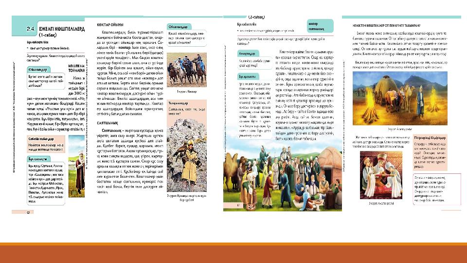 1.Ежелгі көшпелілер қандай табиғат құбылысына табынған? 2.Көшпелілер ата - баба рухын қалай дәріптеді? 3.Қалай ойлайсыздар көкпар ойыны салт- дәстүрге қалай айналған? 4.Неліктен көшпелілер жаңа жылды көктемде тойлаған? 5.Жыртқыш құстарды қолға үйретіп, аңға салу өнері қалай аталған?