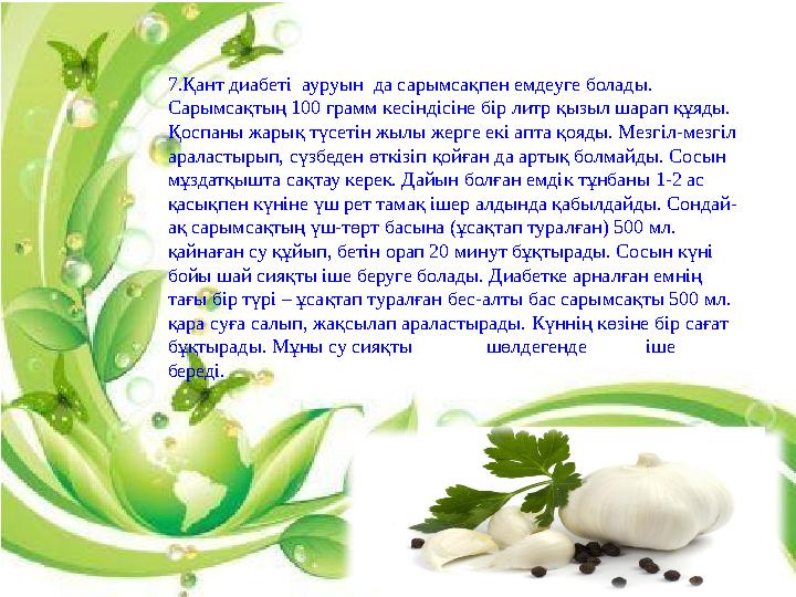 Мақсаты: Сарымсақтың өзіндік ерекшеліктерін таныта отырып, оның адам ағзасына тигізетін пайдалы жақтарына терең талдау жасау. Сарымсақты тұрмыста пайдалану және оның емдік қасиеттерін ашып көрсету.