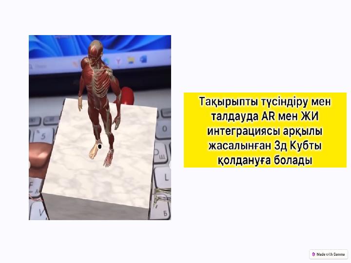 ҚМЖ ға тапсырмаларды АR мен ЖИ дің интеграциясын, тапсырмаларды ЖИ ден іздеуді және кітаптағы мәліметтермен салыстыруды үйретеміз. Оқушыларындың назарын қызықтыра алатын анимацияларды кірістіре аламыз.