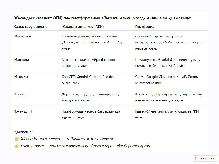 Тақырыпты түсіндіруде немесе топтық жұмысты қорғауда пайдалануға болады. Бұл оқушылардың ЖИ сауаттылығын арттырады. Сабаққа ерекшелік береді