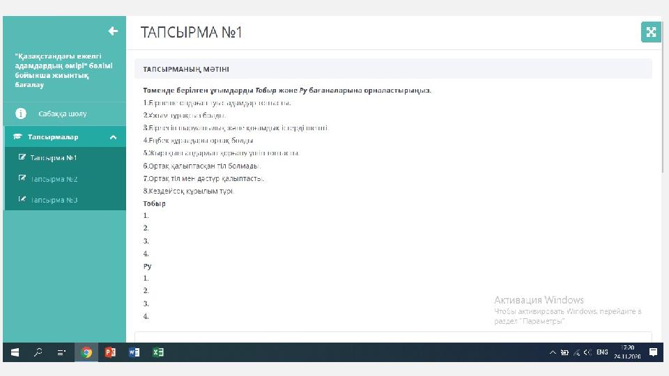тест-тапсырмасы; немесе - сабақ тақырыбы бойынша кестені толтыру