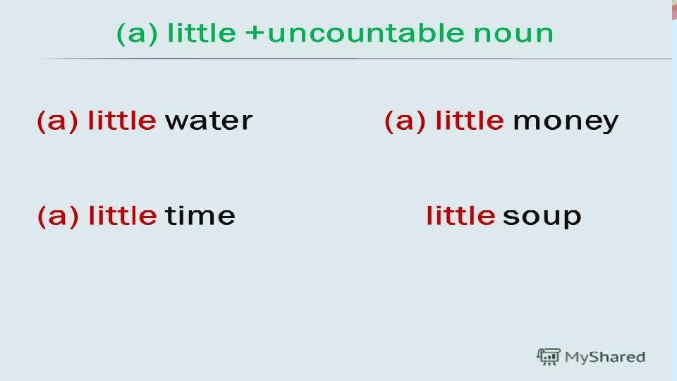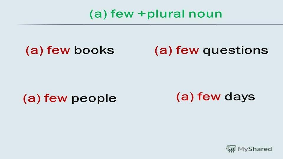 CHECK YOUR ANSWER Task 1. A) Put in a lot of/much/many. 1. Do you drink… much …tea? 2. I like reading. I have got… a lot of …books . 3. It costs… a lot of …money to travel around the world. 4. Please be quick! I have not got… much …..time. Task 2. B) Put in «little» or «a little»/«few» or «a few». 1. There was…… little …food in the fridge. It was nearly empty. 2. When did you see Sarah? …… a few ….days ago. 3. He is very lazy. He does… little ….work. 4. They are not rich but they have got… a little …money – enough to live.