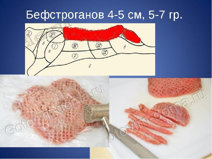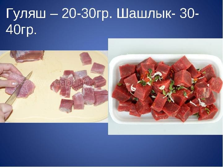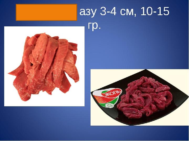 . Жаңатақырыптытүсіндіру , , , Ұсақкесектішалафабрикаттарғабефстроганов азу гуляш қуырма . жатады Бефстрогонафты ( ) ( ) , жуан арқа жәнежұқа бел шеттерінен - , 1- жамбас санбөлігініңжоғарыжәнеішкікесектерінен қалыңдығы 1,5 . 0,5 смболатынсыбағакесектерінетурайды Содансоң см 3-4 , 5-7 қалыңдылыққадейінжаншидыдаұзындығы см массасы кг . томаршаформасынберіптурайды Азуды - , жамбас санбөлігініңбүйіржәнесыртқыкесектерінен 1,5-2 қалындылығы смсыбағакесектерінетурайдыжәне бефстрогановдайындағантомаршаларданекіесеқалыңтомарша . формаларынакеседі 10-15 . Массасы кг Қуырма , бөліктіңжуанжәнежұқашеттерінен - , жамбас санбөлігініңжоғарыжәнеішкікесектерінен 2 , , қалындығы сметіп жаныштап . томаршаформасындакеседі . Гуляш Жауырынжәнежауырын , , астыбөліктерінен жиекетінен , 20-30 , тәстіктентекшешелеп массасы г 4-5 әрсыбағаға данаданкелетіндей . етіпкесектергетурайды