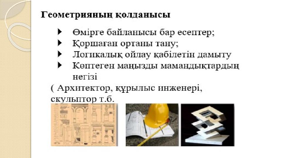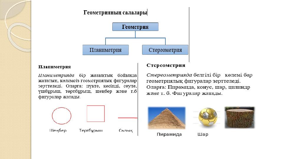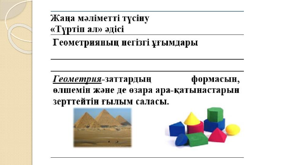 Жаңа мәліметті түсіну «Түртіп ал» әдісі Геометрия грек тілінен аударғанда «жер өлшеу» деген мағынаны білдіреді. Геометрия екі бөлімнен тұрады. Планиметрия және стереметрия. Планиметрия жазықтықтағы фигуралардыГеометрия (гр. geometrіa, ge — Жер және metrio — өлшеймін) — математиканың кеңістіктік пішіндер (формалар) мен қатынастарды, сондай-ақ, оларға ұқсас басқа да пішіндер мен қатынастарды зерттейтін саласы. Фигуралар кеңістіктік пішіндер болып есептеледі. Геометрия тұрғысынан сызық — “сым” емес, шар — “домалақ дене” емес, олардың барлығы да — кеңістіктік пішіндер. Ал кеңістіктік қатынастар — фигуралардың мөлш. мен орналасуын анықтайды.