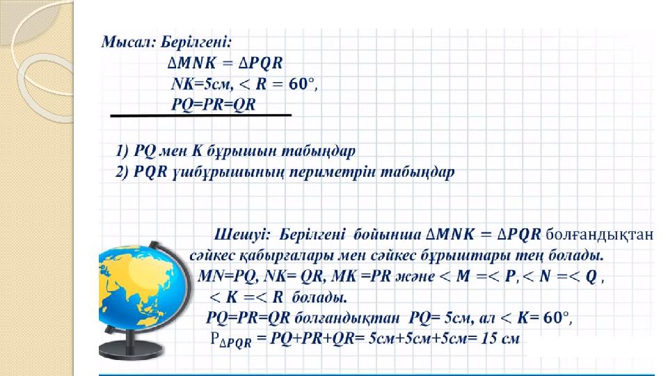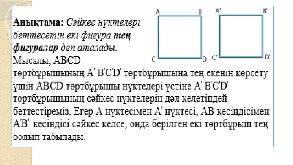 Сабақтың тақырыбы: Фигуралар теңдігі 7.1.1.7 тең фигуралардың анықтамасы мен қасиеттерін білу және қолдану;