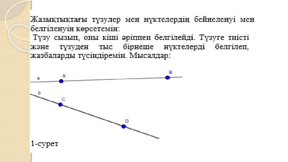 Сабақтың тақырыбы: Геометрияның негізгі ұғымдары.Аксиома. Теорама. •7.1.1.1 планиметрияның негізгі фигураларын білу: нүкте, түзу; •7.1.1.5 кесінді, сәуле, бұрыш, үшбұрыш, жарты жазықтық анықтамаларын білу; •7.1.1.2 нүктелер мен түзулердің тиістілік аксиомаларын білу және қолдану; •7.1.1.3 аксиоманың теоремадан айырмашылығын түсіну: теореманың шарты мен қорытындысын ажырату;