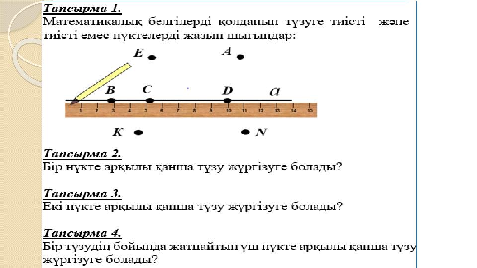 Тапсырма2 а түзуін жүргізіп, оның бойынан А және В нүктелерін белгілеңдер. а) АВ кесіндісінде орналасқан М және N нүктелерін белгілеңдер; б) а түзуі бойынанда жататын, бірақ АВ кесіндісінде жатпайтын P және Q нүктелерін белгілеңдер в) а түзуінде жатпайтын R және S нүктелерін белгілеңдер.