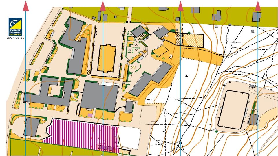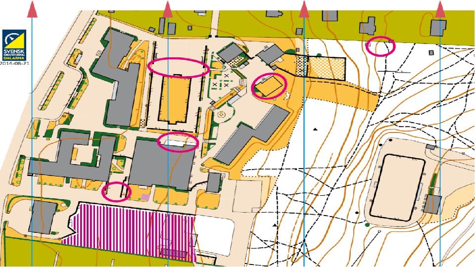 Қызыл (немесе күлгін) түспен жарыс қашықтығы бейнеленеді – старт, бақылау пункттері,