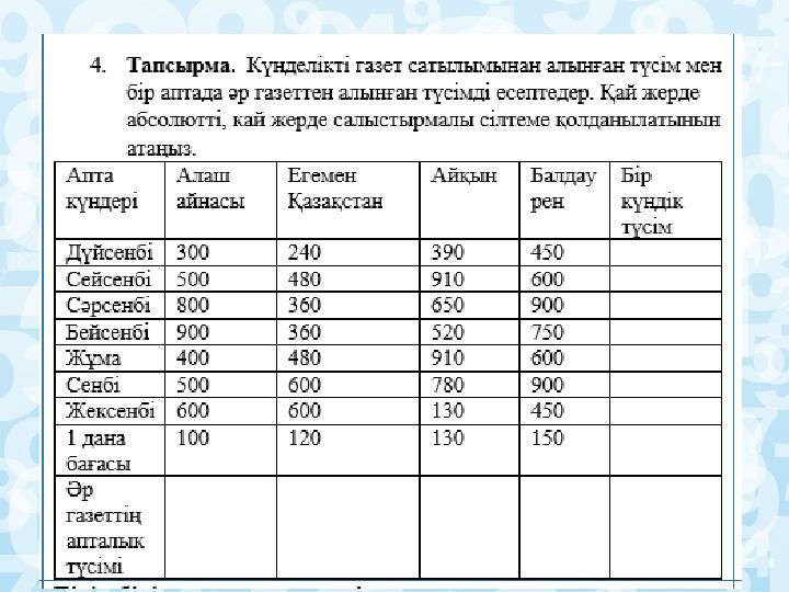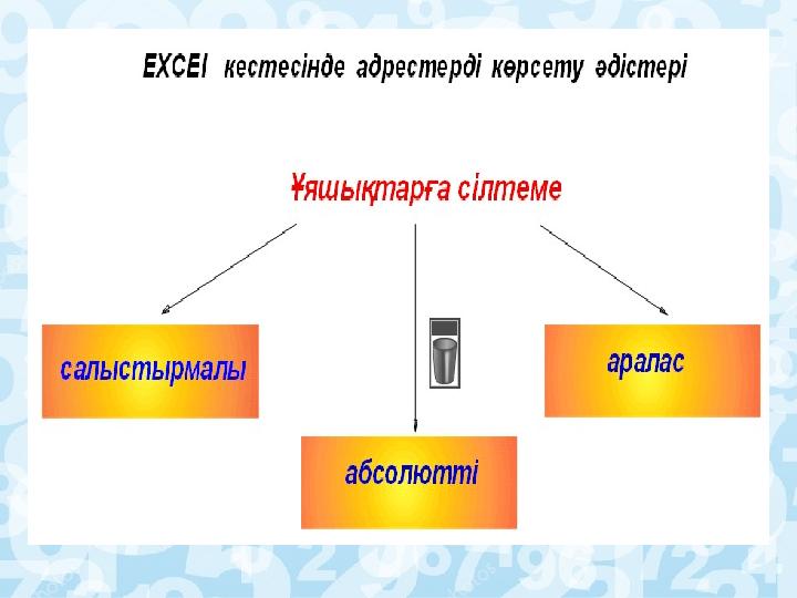 1.Тапсырма. Сілтеме түрлеріне анықтап, ережесін сәйкестендір. (Т) (А деңгейі) «Кластер» әдісі Сілтеме Формуланың көшірмесін жасау барысында ұяшықтын адресін өзгермеуі Белгілі бір ұяшықтын берілген ұяшыққа салыстырмалы түрдегі адресін көрсетеді Бағаны абсолютті, ал жолы салыстырмалы немесе керісінше болатын адрестеу түріАбсолютті Салыстырмалы Аралас Критерий Дискриптор Сілтеме түрлерін және ережесін анықтау - Сілтеме түрлерін анықтады; - ережелерін сәйкестендіреді