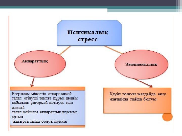 •Стресс дегеніміз не? Психологтар «стресс» тақырыбын ұзақ уақыт бойы зерттеп, оның себебін түсінуге және одан шығу үшін адамдарға жол ашуға тырысты. ХХғ. 30-50 жылдары канадалық ғалым Ганс Селье стресстің биологиялық теориясын жасады. Оған мынадай ғылыми анықтама беріледі: Стресс – аса күшті сыртқы әсерден жүйкенің жоғарғы деңгейде ширығуы.