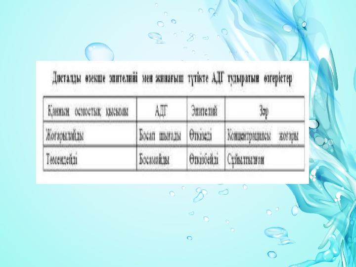 Сабақ 15. Су алмасуды реттеу. Нысана-мүшелер Мақсаты: су алмасудың реттелуін, нысана-мүшелерді оқып-үйренесіздер. Су мөлшерін бақылаудағы антидиуретикалық (АДГ) гормонның рөлін түсіндіре алатын болсыздар.