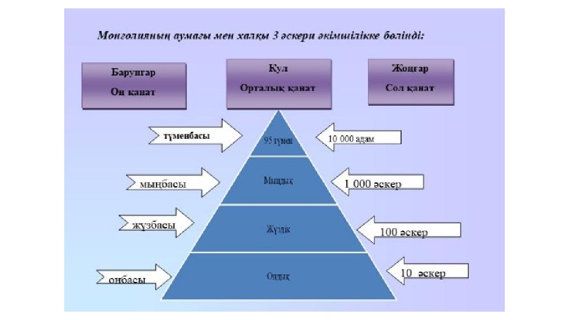 Моңғол қоғамының шаруашылығы, діни-наным сенімдері,мәдени өркениеті Шаруашылығы Моңғолдар жартылай көшпелі өмір салтын ұстанып, маусымға байланысты жайлау мен қыстауға көшіп отырды. Ет пен сүт өнімдері (қымыз, айран, ірімшік) негізгі тағам түрі еді. Жылқы ерекше маңызға ие болды – соғыста да, тұрмыста да қолданылды. Сауда-саттықта жүн, тері, мал өнімдері айырбас ретінде жүрді. Діни наным-сенімдері Шыңғысхан дәуіріне дейін моңғолдар тәңіршілдікке сенді – яғни, Көк Тәңірді ұлы күш деп таныды.Олар табиғатқа және ата-баба рухына табынды: аспан, отқа құрметпен қарады,рухтарға тағзым етті. Шыңғысхан билікке келген соң, дін бостандығын жариялап, барлық сенім өкілдеріне құрмет көрсетті.Империяда буддизм, христиандық, ислам және даосизм өкілдері еркін өмір сүрді. Мәдени өркениеті мен тұрмысы Моңғолдарда жазу мәдениеті дамыды: ұйғыр жазуын қолданды. Киімдері киіз бен жүннен тігілді, ерлер көбіне шекпен мен қалпақ, әйелдер сәукеле тәрізді бас киім киді. Мәдени байланыстар дамыды: жаулап алынған елдерден ұсталар, зергерлер, суретшілер мен ғалымдар Моңғол ордасына келіп еңбек етті. Қалалар мен сауда орталықтарында мектептер, мешіттер, шіркеулер, монастырлар ашылды.