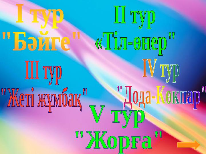 V тур «Жорға» 1.Терезе нешеге бөлінеді? 2.Бағыттауыш пернелерді ата. 3.ІІ буын машиналарын неден тұрады? 4.Компьютер құрылғылары нешеге бөлінеді? 5.Функционалдық пернелер нешеу? 6.Дыбыс шығару құрылғысы. 7.Ақпараттың ең кіші өлшем бірлігі. 8.Жыпылықтап тұратын тік сызықша. 9.Енгізу құрылғысы. 10.Монитор қандай құрылғы? 11.Графиктік редактор. 12.Бас әріптер режиміне көшу пернесі. 13.Жад нешеге бөлінеді? 14.ІІІ буын машиналары неден тұрады? 15.Калькулятордың неше түрі бар? 16.Пернетақтада қанша перне бар?