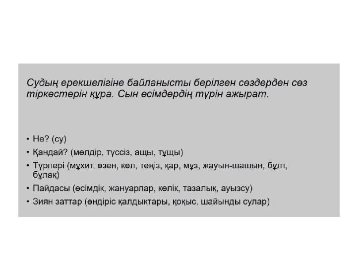 Дескриптор •Әр бөлікке тақырыпша қояды -3 балл •Мәтіннің мазмұнына байланысты 4 сұрақ ауызша құрастырады, есімдіктерді қолданады - 4 балл •Мәтіндегі қою қаріппен жазылған сөздердің синонимін, антонимін дәптеріңе жазады.- 3 балл •Жиынтығы: 10 балл