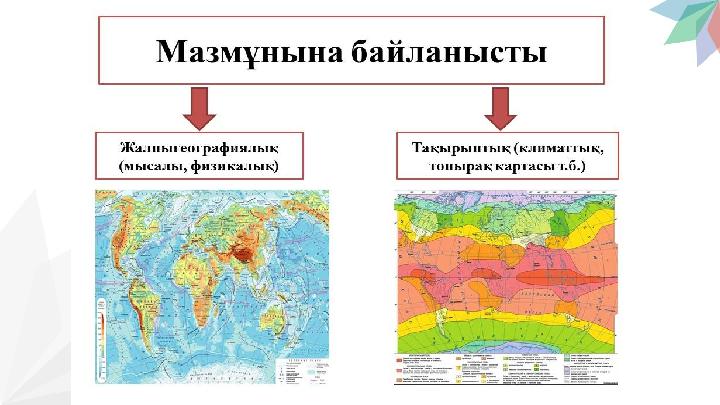 Тақырыптық карталар Физикалық- географиялық карталар Әлеуметтік-экономикалық карталар Арнайы карталар Геологиялық, геофизикалық,жер бедері, мұхиттық, климаттық, гидрологиялық, өсімдіктер, топырақ, зоогеографиялық,экологиял ық карталар. Халықтар картасы , экономикалық карталар. Қызмет көрсету карталары, тарихи карталар, саяси карталар, навигациялық карталар, техникалық карталар, жобалау карталары.