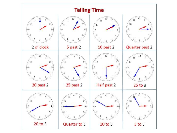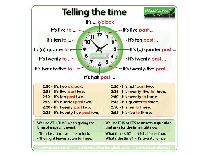 Asking * What’s the time, please? * Have you got the time? * What time is it, please? Telling * It’s five o’clock * It’s half past two * It’s ten past three * It’s twenty to ten