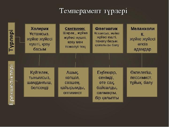 Мақсаты: Студенттер ж аңа материал бойынша танысқан алғашқы ұғым – темпераменттің анықтамасын, темперамент жөніндегі физиологиялық ілімін, Темпераменттердің ерекшеліктерін талдайды, типтерді өзара салыстырады және байланыстырады , тақырыптың негізгі тұстарын біледі. Күтілетін нәтиже: Студенттер тапсырмалар орындау барысында ойларын жинақтай алады, пікір алмаса алады, түйінді ойды саралауға үйренеді, талқылай алады, сұрақтарға жауап береді және қорытындай алады