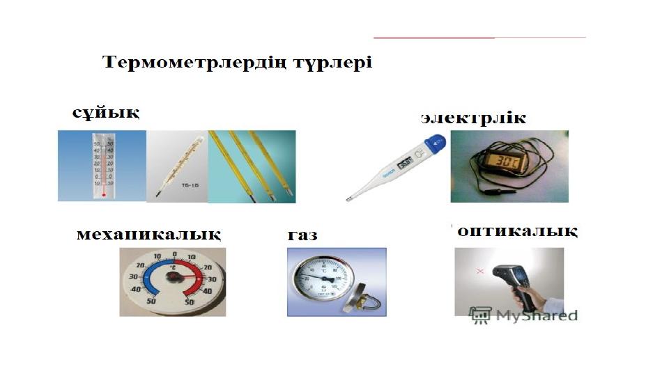 Термометр – температурасы өлшенетін денемен жылулық байланыста болатын құрал. Температураны термометрдегі термометрлік заттың көлемі бойынша анықтайды. Атмосфералық қысымдағы таза судың қайнау және қату температуралары айырымының жүзден бір бөлігі градус деп аталады. Табиғаттағы ең төменгі шектік температура -273,15 С-қа тең. Ол температураның абсолют нөлі деп аталады. ХБЖ-де температураның өлшем бірлігі КЕЛЬВИН T=(t+273) К Температура -макроскопиялық жүйенің термодинамикалық тепе- теңдік күйін сипаттайтын физикалық шама
