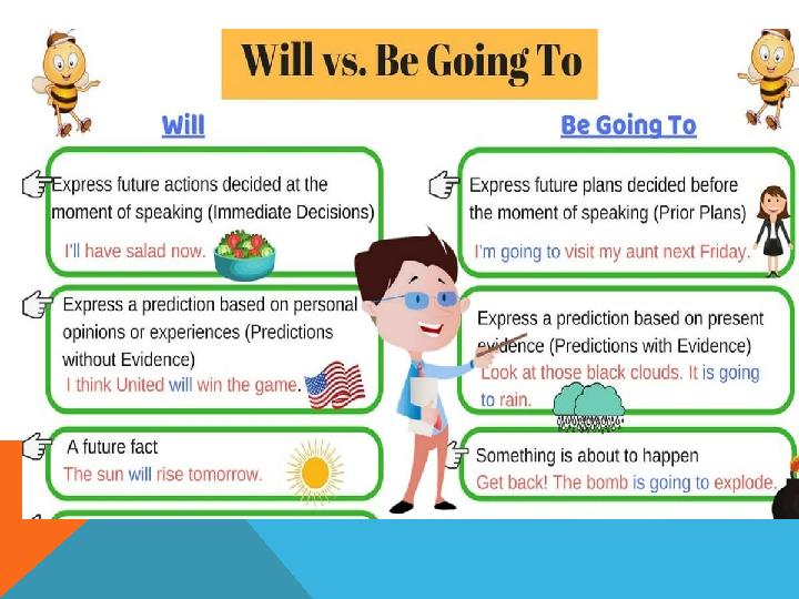 1 Ex. 5 p.95 Write sentences with be going to (for plans and intentions) or will (for predictions). I think that our team will win. (win) 1.The players ____ tomorrow morning. (meet) 2.That was brilliant! Your manager _____ very happy with you. (be) 3.The finalists ____ at three o’clock. (play) 4.Maybe you ____ a journalist when you’re older. (be) 5.Her trainer ____ next month. She told me yesterday. (leave)