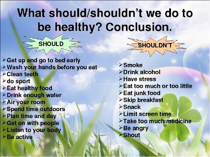 Look and remember!  We use should and shouldn't to give advice or to talk about what we think is right or wrong .  Examples:  We should get a good nights sleep ( Түнде жеткілікті ұйқтауымыз керек)  We shouldn’t eat too much junk food ( Бізге зиянды тағамдарды жеуге болмайды.)