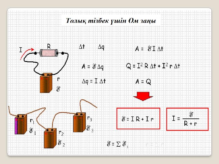 Толық тізбек үшін Ом заңы Әр түрлі материалдан жасалған, әр түрлі ұзындықтағы цилиндрлік сымның кесектерін алдым және оларды тізбекке кезекпен қоя бастадым….. Георг Ом … Омны жа алы ын абылдау ылыми орталарда абылданды. Б л ылымны дамуына ң ң ғ қ ғ қ ұ ғ ң сер етті, тек 20 жылдан кейін Кирхгоф дамытты ә