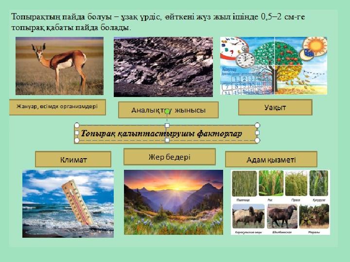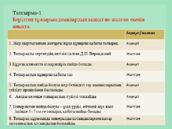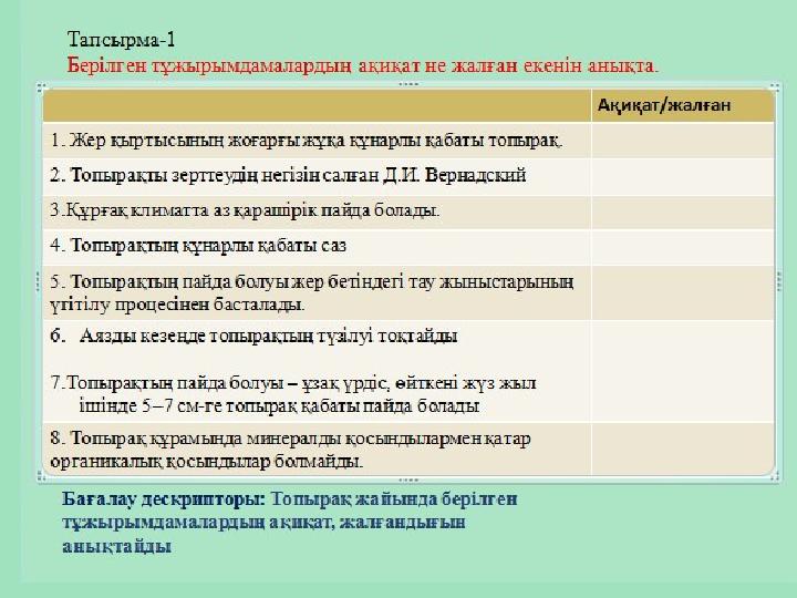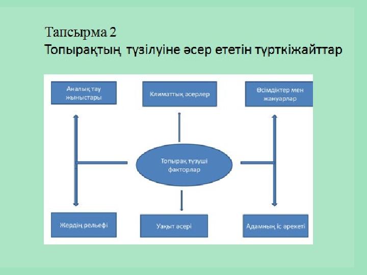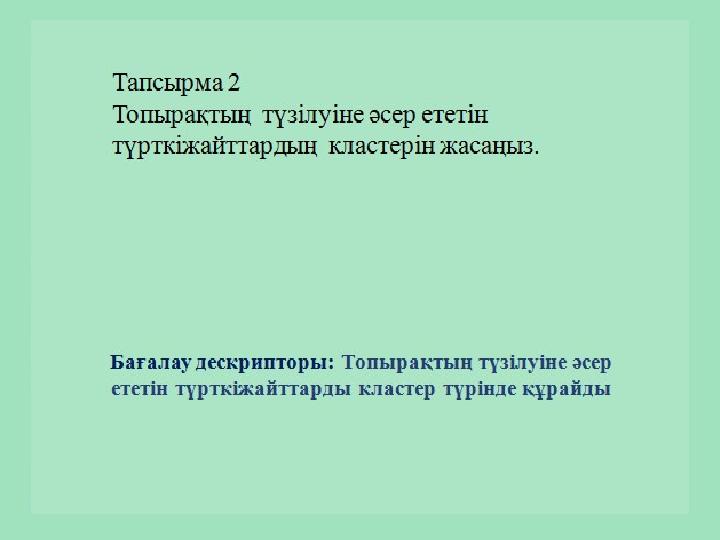 Сабақтың тақырыбы: Топырақ және оның құрамы мен құрылымы Оқу мақсаты: 7.3.4.2 -топырақ құрамын, түрлерін анықтап, құрылымын графикалық түрде көрсетеді Бағалау крийтерилері: Топырақтың құрамындағы заттарды анықтайды. Топырақ түзуші түрткіжайттарды сипаттайды.