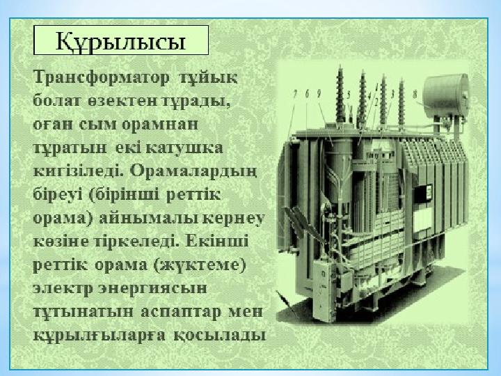 *Трансформатор дегеніміз – айнымалы токтың жиілігін өзгертпей, кернеуін өзгертуге арналған электрмагнитті аппарат.