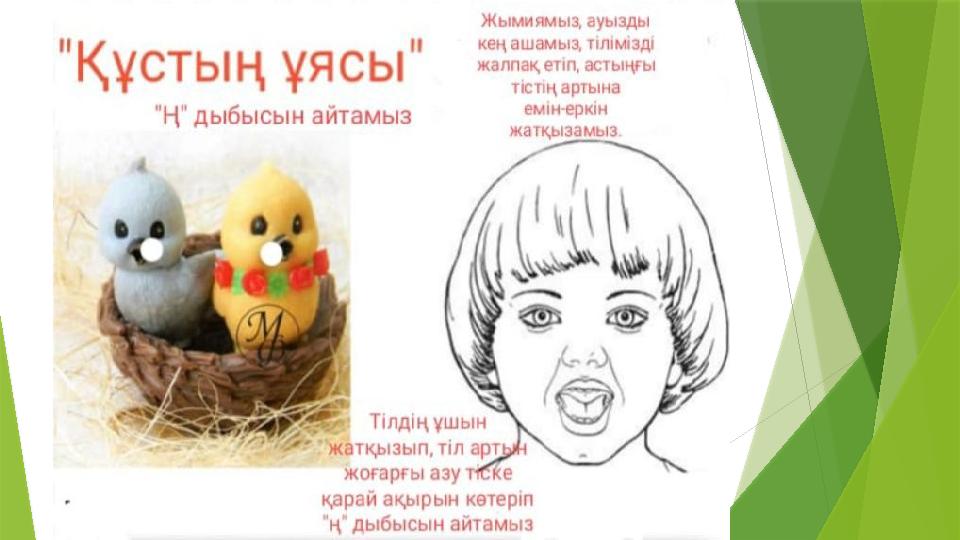 Мақсаты: 1. «Ң» дыбысын дұрыс айтуға арналған артикуляциялық жаттығуларды дұрыс орындауға үйрету. 2. «Ң» дыбысын дұрыс айтуға арналған дем алу жаттығуларын үйрету 3. «Ң» дыбысының дұрыс артикуляциялық қалпымен таныстыру.