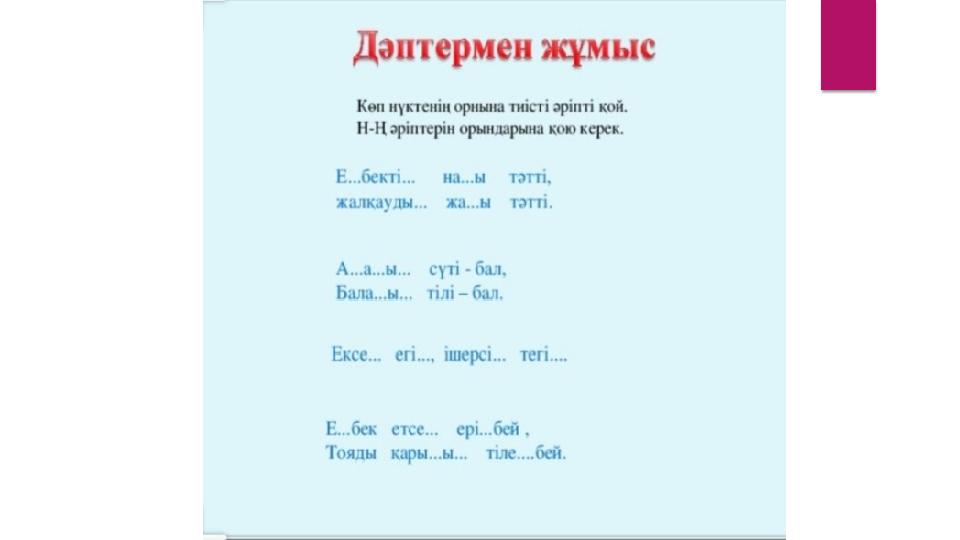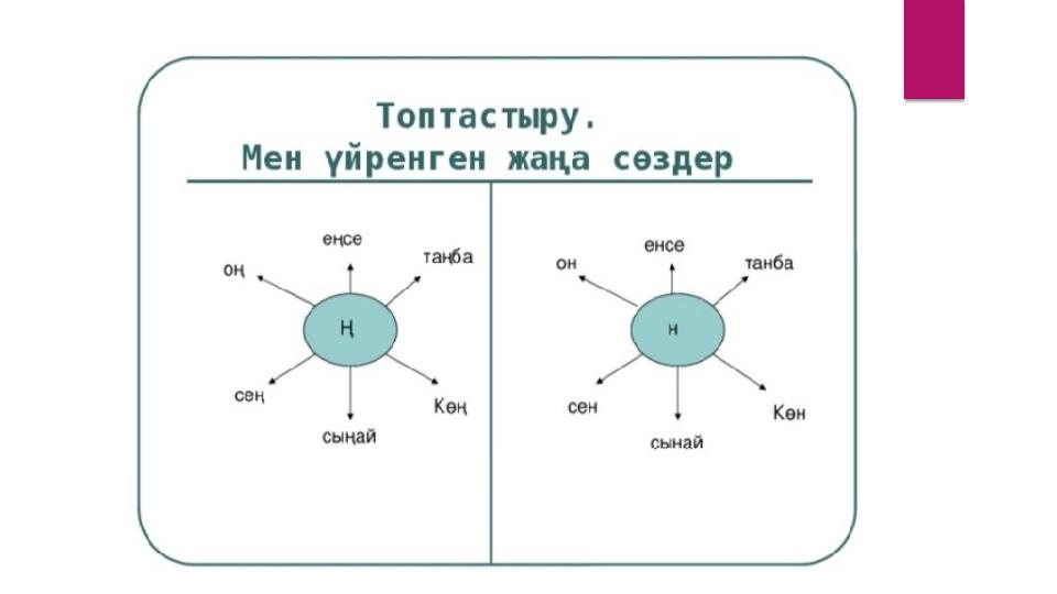 Мақсаты: 1. «Ң» дыбысын «Н» дыбысынан сөздерде, буындарда, ауызекі сөйлеуде ажырату. 2. Н-Ң дыбыстарын есту арқылы ажырату. 3. Н-Ң дыбыстарын жазуда ажырату.