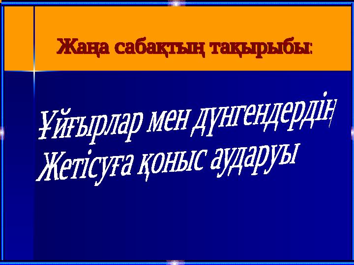 С а б а қ т ы ң т а қ ы р ы б ы : С а б а қ т ы ң т а қ ы р ы б ы : Ұйғырлар мен дүнгендердің Жетісуға қоныс Ұйғырлар мен дүнгендердің Жетісуға қоныс аударуыаударуы Қазақстан тарихы 8 - сынып