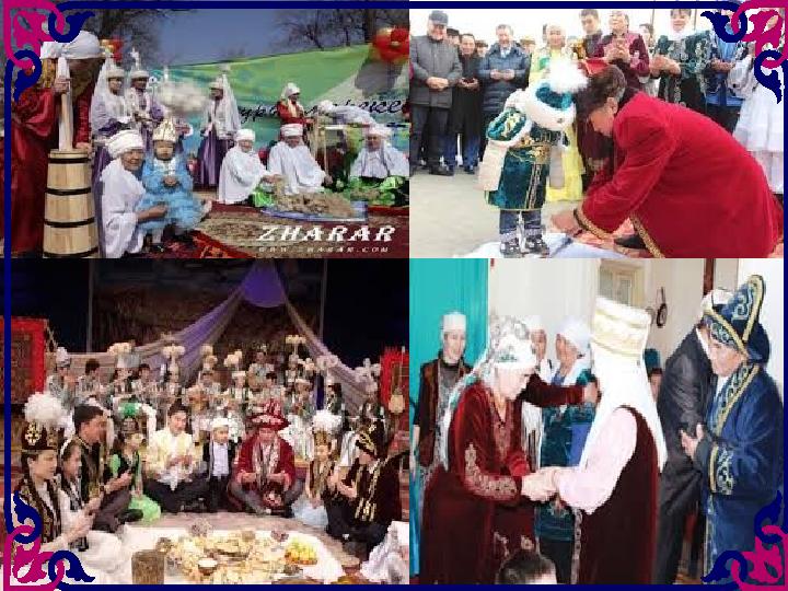 Ұлттық салт-дәстүрлер Жоғалып бара жатқан салт-дәстүрлер Қыз қуу Ерулік Сүйек жаңғырту Келін көңілі Пайғамбар қарызы Мал сілекейі Қазір қолданып жүрген салт-дәстүрлер. Беташар Тұсау кесер Бесікке салу Баланы қырқынан шығару Мұң-шер әндері