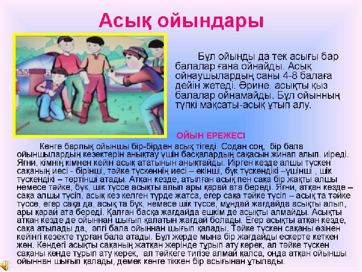 Ойнамайтын бала жоқ, ойынға қызықпайтын адам, сауық құрмайтын халық жоқ. Үлкен де, кіші де ойнап көңіл көтереді, бір нәрсеге беріле қызығады, әр жетістіктен қанағат табады