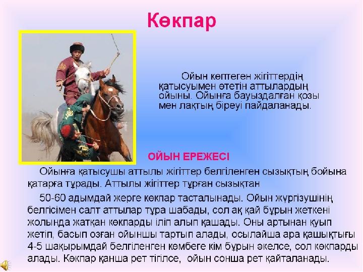 Ұлттық ойын – салауатты өмір салтын мұрат тұтқан арманшыл, елі мен жерінің қамын ойлайтын, ұлтқа тән барлық қасиетті қадір тұтатын, дара тұлға-жаңа адамды тәрбиелеп шығарудың құралы