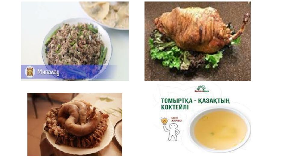 Қазақтың ұлттық тағамдары , Жасымнан жақын маған бәрі. Теңгермес ем оларға мен , Ешбір асты ғаламдағы. Мал шаруашылығымен айналысқан көшпелі қазақтардың негізгі тағамы – ет пен сүттен жасалған . Биенің сүтінен қымыз ,түйе сүті нен шұбат дайындаған. Заман алмасып, ұрпақ жаңарған сайын кейбір ұлттық тағамдар да күнделікті тұрмыс дастарқанымыздан ұмытылып бара жатыр. Мұндай тағамдар өте көп.