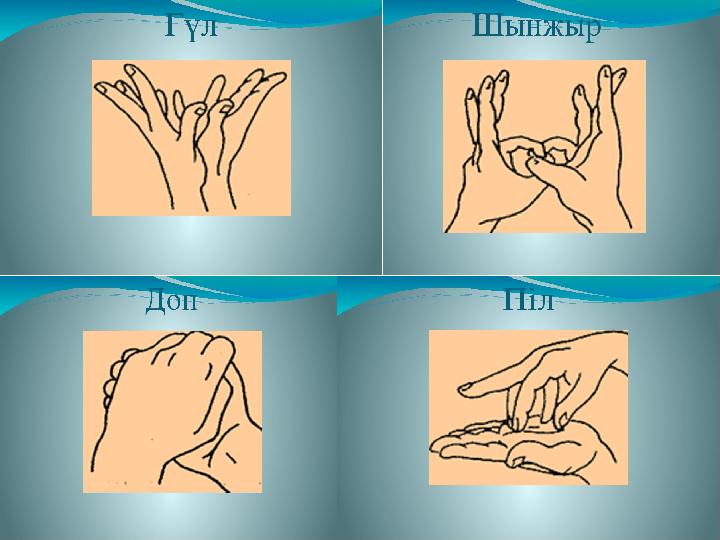 Ұсақ моториканы дамыту үшін гимнастика. Қолды тік қою, саусақтарды тығыз бүгу және баяу жұдырыққа түю. Кезекпенен орындау.Алақанды төмен қаратып қолды үстелге қою және кезекпенен саусақтарды бүгү. Кезекпен орындау. Қолды тік қою және бас бармақты кішкентай бөбекке, ортан теректі балал үйрекке қосу. Кезекпенен орындау.