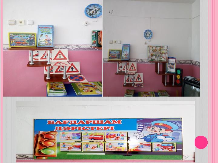 "ЖОЛ ЖҮРУ ЕРЕЖЕЛЕРІН ҮЙРЕНУ" БӨЛІМІ БОЙЫНША ӘДІСТЕМЕЛІК "ЖОЛ ЖҮРУ ЕРЕЖЕЛЕРІН ҮЙРЕНУ" БӨЛІМІ БОЙЫНША ӘДІСТЕМЕЛІК КАБИНЕТТЕ ЖАСАЛҒАН ТОПТАРДЫҢ ЖҰМЫСТАР ЖИНАҒЫКАБИНЕТТЕ ЖАСАЛҒАН ТОПТАРДЫҢ ЖҰМЫСТАР ЖИНАҒЫ Көрнекі құралдар Әдістемелік және әдеби кітаптар жинағы Жол жүру ережесін насихаттау бойынша мерекелер, саяхаттар, кеңестер, ашық көрілімдер жинағы Фотоальбом, балалар суреттері Жол-көлік жарақатының алдын алу бойынша плакаттар жиынтығы Ата-аналармен жұмыс материалдары Жол белгілері, бағдаршам макет