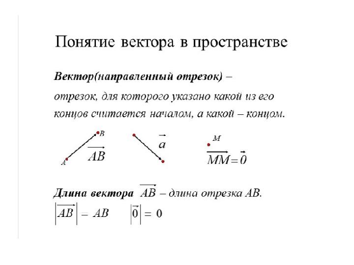1.Направленный отрезок называется - вектором. 2. Векторы, параллельные одной прямой или лежащие на одной прямой называют - коллинеарными векторами. 3. Два коллинеарных вектора, если их направления совпадают, называются - сонаправленными векторами. 4. Два коллинеарных вектора, если их направления противоположны, называются - противоположно направленными векторами.