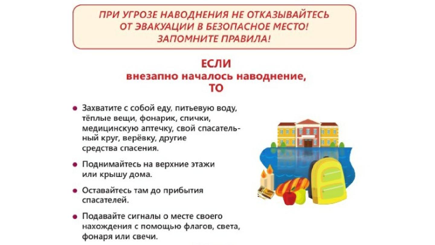 Если вода прибывает 1. Срочно поднимись на верхние этажи или чердак. 2. Не пытайся переплыть поток воды пешком или на машине. 3. Жди спасателей на возвышенном месте и подавай сигналы (фонариком или яркой тканью).